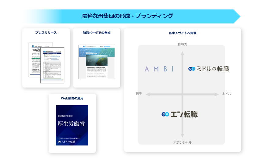 プレスリリースや特設ページ、Web広告での告知に加え、各求人サイトでの集客サポートを実施いたします。『エン転職』『AMBI』『ミドルの転職』とターゲットの異なる3つの求人サイトを活用することで、ターゲットへ網羅的に求人を届けます。
