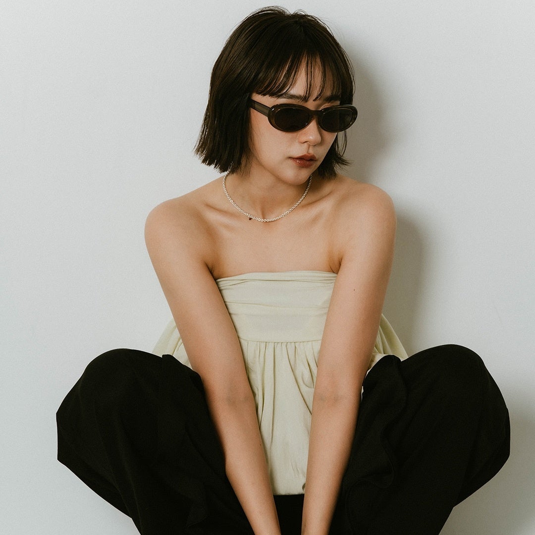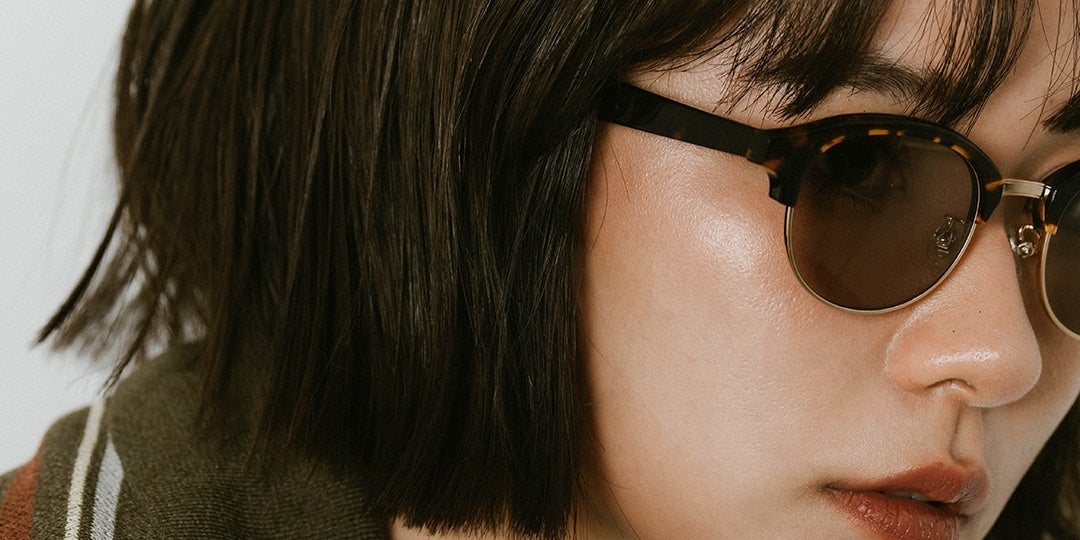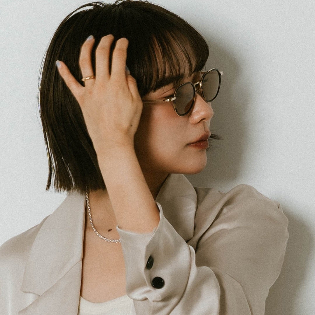 馴染みやすさがありつつも、 甘く転ばないウェリントン型。やや太めのサングラスが個性を引き出してくれる。