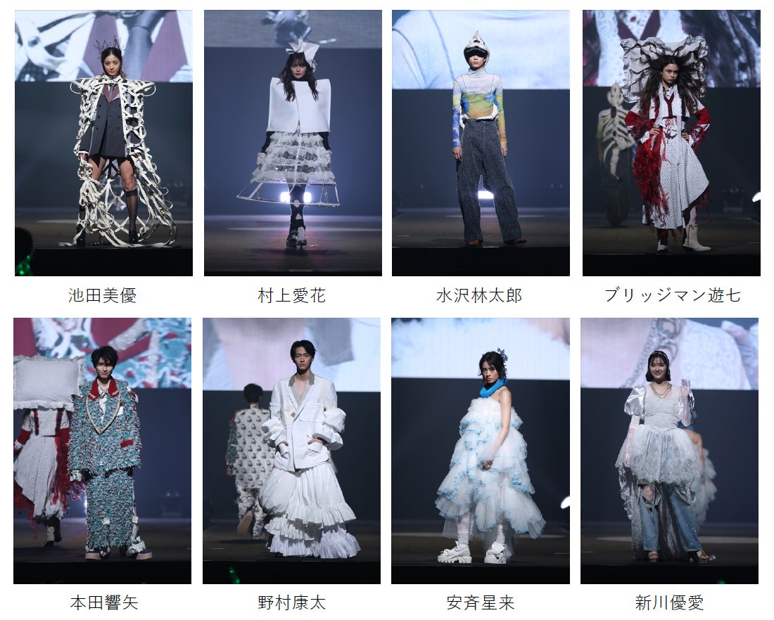 オープニングは、スタイリスト中野雅世⽒が手がける「再⽣と膨張」をテーマにしたファッションショー。文化服装学院の学生がアップサイクルしたアイテムを取り入れたクリーンで華やかなスタイリングと大胆なヘッドピースが印象的なコーディネートの数々がランウェイを彩りました。