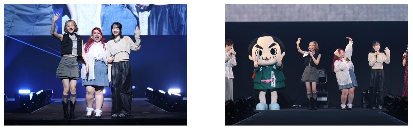 SNS総フォロワー数驚異の約1,000万⼈!エア、UraN、浅⾒めいからなる個性派揃いの“期限切れJK”3⼈組動画クリエイターくれいじーまぐねっとが、“おでかけ”を表現したコーディネートでランウェイに登場!トークパートでは、観音寺市のシンボル「銭形砂絵」の「銭形」と「銭形平次」のイメージから誕生した銭形くんも登場し、本イベント前日にくれいじーまぐねっとが周遊した観音寺市、三豊市のおすすめスポットやグルメなどの魅力を、それぞれ写真とともに振り返り、観音寺市、三豊市どちらに行きたくなったか、を会場の皆さんにジャッジしてもらうコンテンツを実施。エアは、観音寺市でのグランピングやバーベキュー、雲辺寺山頂公園にある「天空のブランコ」について「グランピングは、瀬戸内海が目の前!海外リゾートかなと思うくらいきれいな場所でした!」とアピールし、浅⾒めいは三豊市の絵付け体験、父母ヶ浜にある絶景やドーナツショップなどについて「絵付け体験は、張り子虎という縁起物として飾られているものに自分で色付けができるんです!」と紹介。最終的には「どちらも選べないくらい魅力的!」と笑顔を見せたUraNが、「香川は2回目でしたが、もっと早く来ればよかった!と思いました。動画も上げる予定なので、それを見て同じように楽しんでください!」とメッセージを送りました。