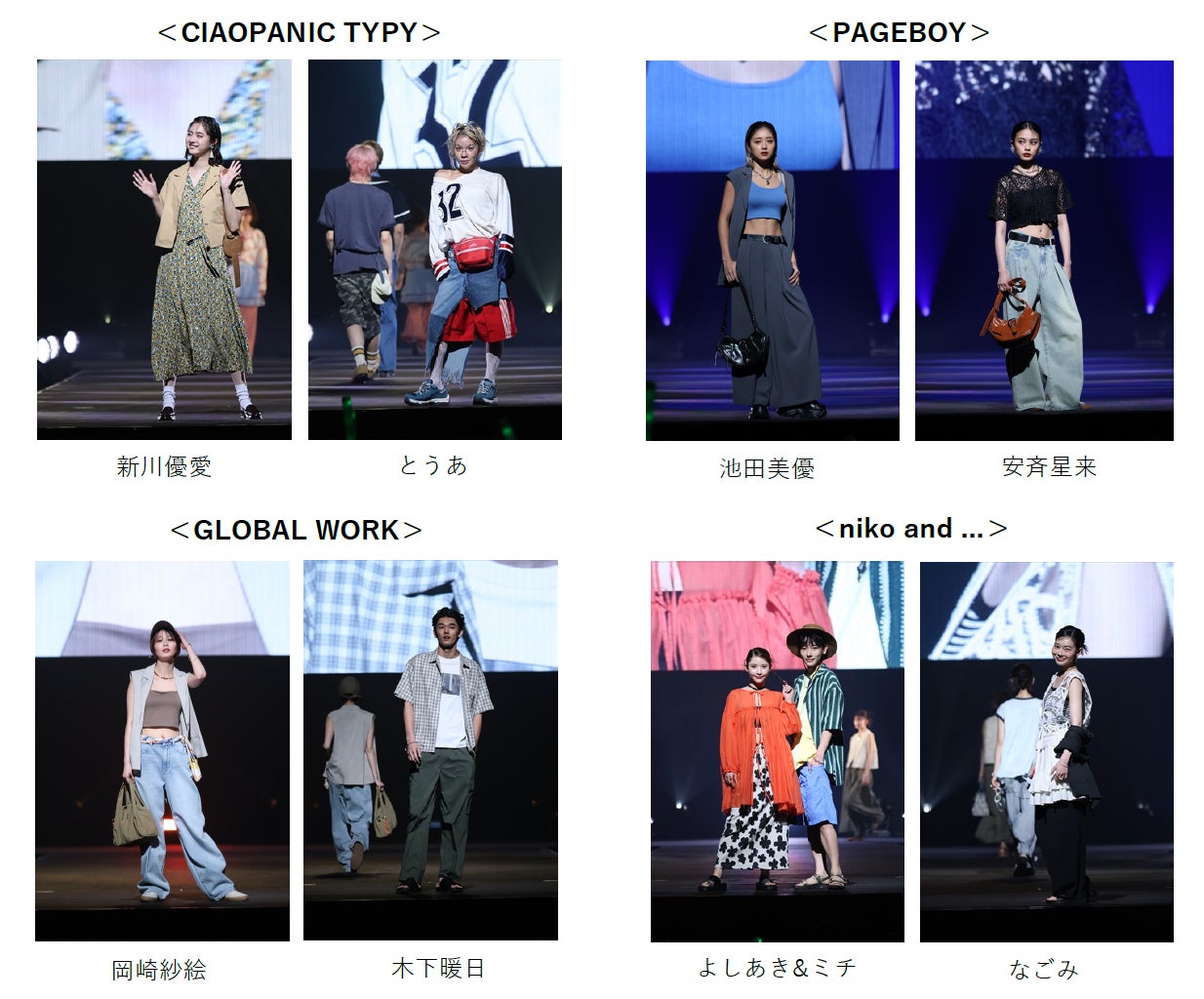 アパレルや雑貨、家具、飲⾷を展開する“style editorial brand”で、実⽤性だけでなく、どこかユーモアを感じさせるアイテムを取り⼊れているniko and ...(ニコアンド)は、トレンドのBOHOにクロシェやチェック柄をプラスしたカジュアルなスタイリングで、国内のみならず、世界のファッションシーンを舞台に活躍するよしあき&ミチ、Z世代のファッションアイコンであるなごみが登場し、ゆめタウン⾼松ステージのラストを華やかに飾りました。