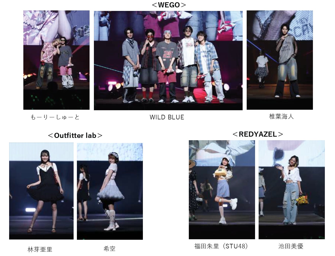 YOUR FANをコーポレートスローガンに掲げ、ファッションの提案にとどまらず、ストリートから派⽣している様々なカルチャーを伝え続け、全国に約180以上のストアを展開するWEGO(ウィゴー)のステージには、B-BOYやB-GIRLのストリートスタイルをベースに、グランジやY2K(2000年代初頭の流⾏)など、さまざまなカルチャーをミックスしたスタイリングで、トップバッターに⼤⼈気リアル兄弟ユニットで、タレント・俳優など個々でも活躍中のもーりーしゅーとが登場。ランウェイトップでお互いの手をぎゅっと繋いでポーズを作り、会場の熱気を一気に高め、続いて今後の活躍に期待が⾼まる⾹川県出⾝の椎葉海⼈、そして、WEGOモデルにも起⽤されているWILD BLUEのメンバー全員が登場。ランウェイトップでは5人が集合し、そろって“あっかんべー”ポーズを見せ、会場を盛り上げました。