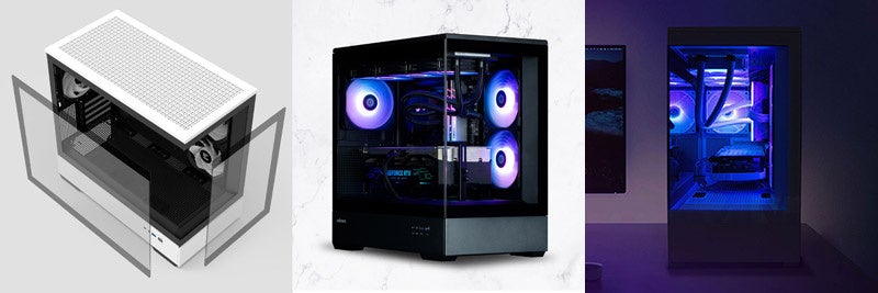 広い内部スペースで大型パーツにも対応し、フロントとサイドに搭載した強化ガラス製パネルにより魅せるPCを組み立てたいニーズに最適です。サイドに搭載したアドレサブルRGBファンは、ブレードの傾きを反対にしたリバース仕様となり、ファンのライティング効果と吸気のエアフローを高めています。本体カラーはブラック、ホワイト、ブラック/ホワイトの3製品をラインナップしています。