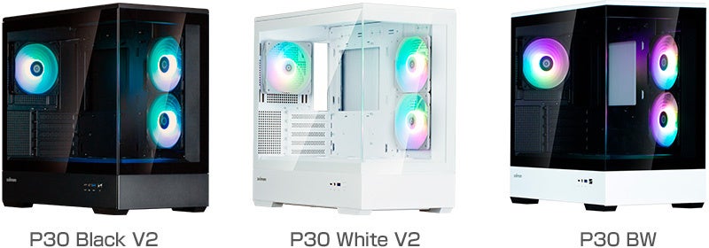 「P30 V2」シリーズは、ご好評いただいております「P30」のリニューアルモデルとなるピラーレスデザインのミニタワー型PCケースです。前機種と比べ、カラーバリエーションが3色に増えたほか、PWM対応のアドレサブルRGBファンに変更、VGAサポートブラケットも新たに搭載され、機能がアップグレードしました。