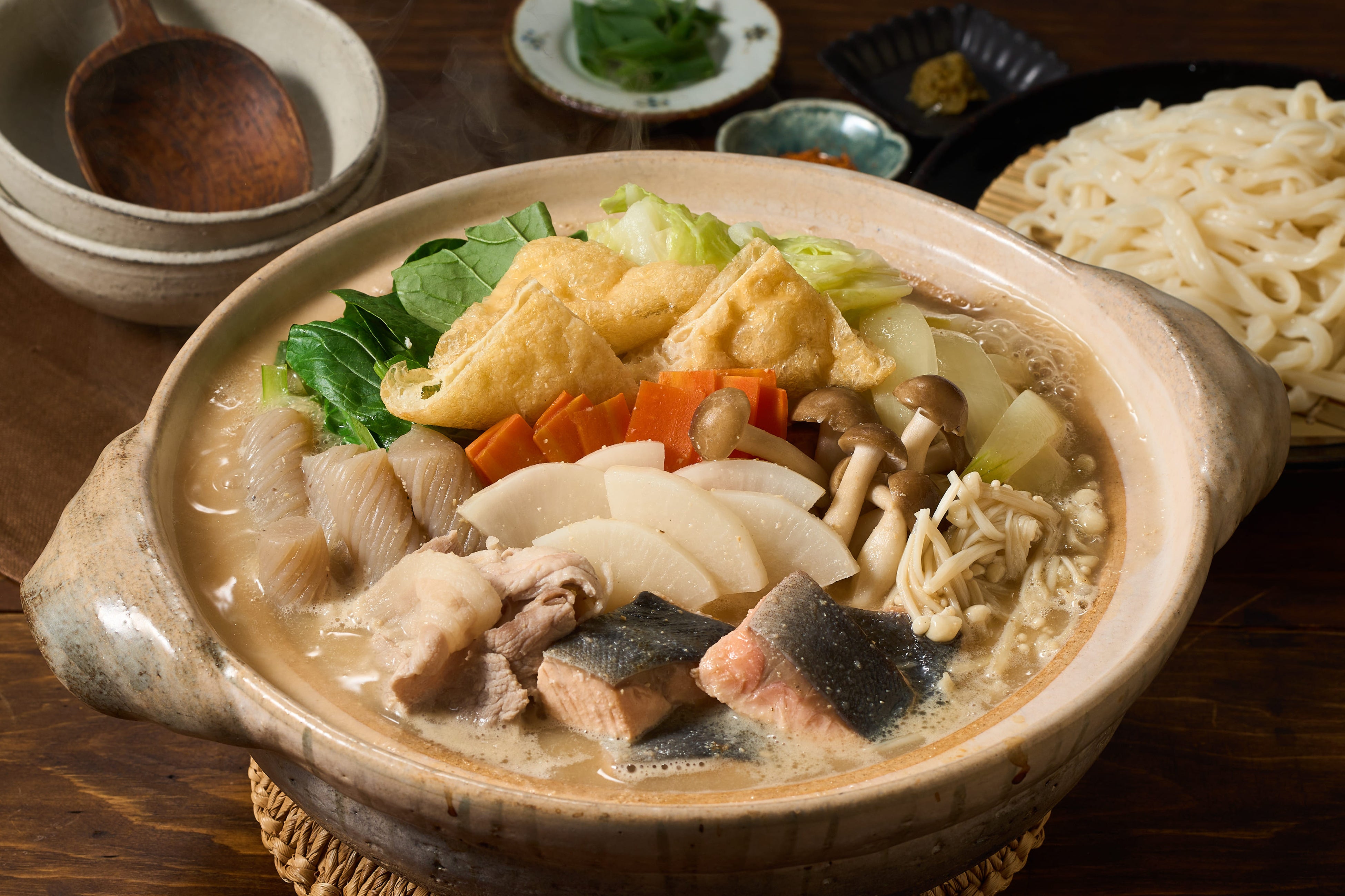 7種の野菜に、豚バラ肉、鮭、こんにゃく、油揚げなど盛りだくさんの具材に、スープには隠し味に酒粕の素を加えた奥深い味わいです。〆は味噌煮込みうどんにして楽しめます。
