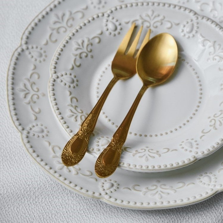 持ち手部分のデザインがアンティーク調でマット素材が高見えするカトラリー。