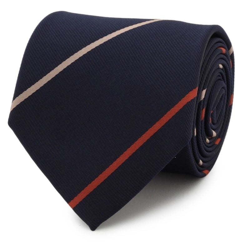 チームカラーであるオーシャンネイビーをベースに、プライマリーロゴに使用されているトラディショナルレッドとブラスゴールドを取り入れました。ストライプのラインは細く、ピッチを広めにしたネクタイはコーディネートのアクセントとなり、洗練された印象を演出できます。