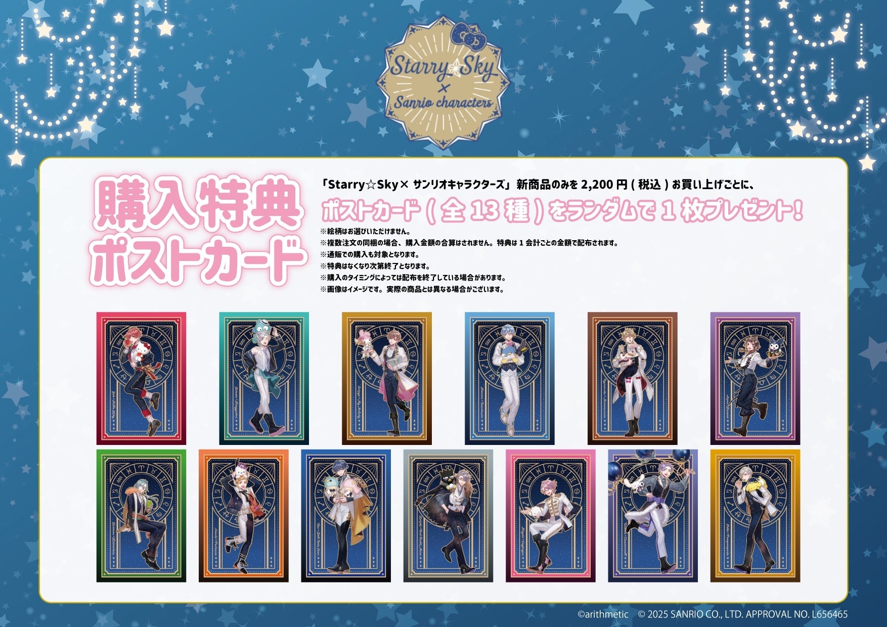 「Starry☆Sky×サンリオキャラクターズ」新商品のみを1会計2,200円(税込)お買い上げごとに、購入特典としてポストカード(全13種)をランダムで1枚プレゼント。