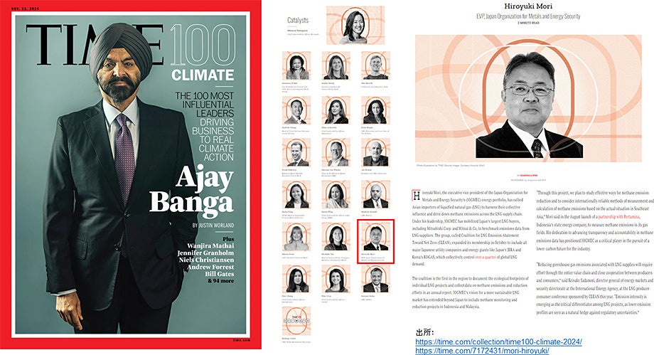 JOGMEC(本部:東京都港区、理事長:髙原 一郎) の理事/エネルギー事業本部長 森 裕之が、2024年11月12日、米誌TIME「2024年気候変動に最も影響力のあるリーダー100名」に選出されたことが明らかになりました。