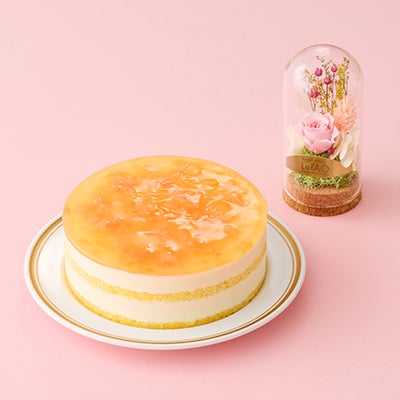 天面にはマンゴーとアプリコットのクリーム、桃のクリームを飾り、感謝のバラをイメージした見た目に仕上げています。