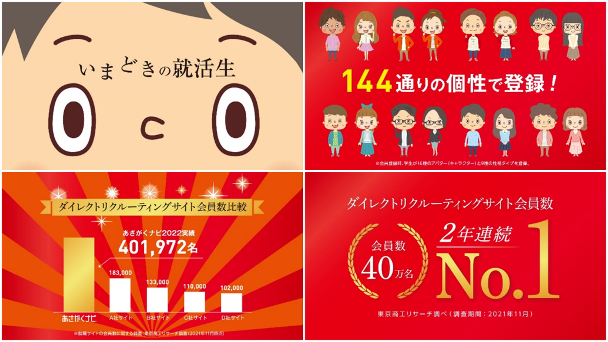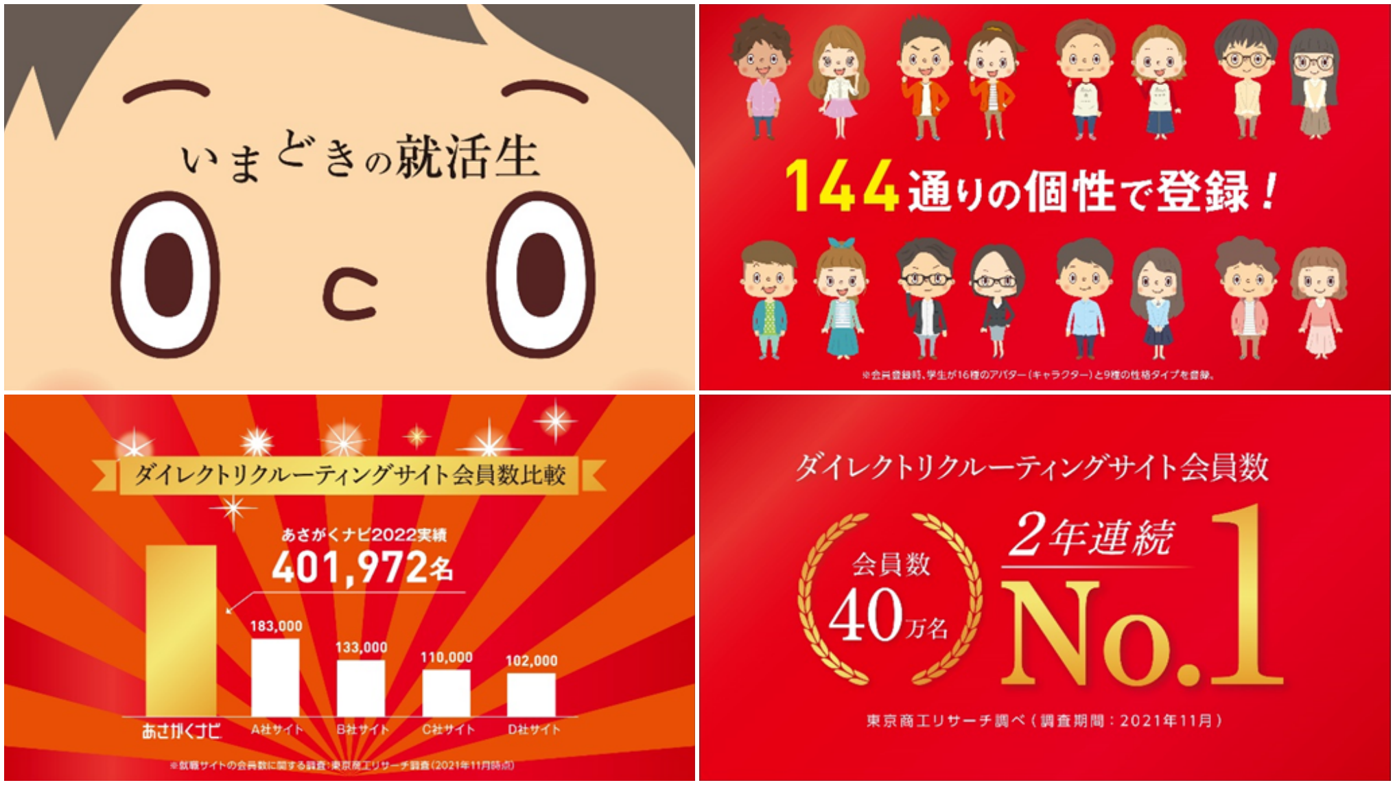 学生が登録する144通りの個性から「スカウトの受信・送信」が可能な特長と、学生から最も選ばれているダイレクトリクルーティングサイトであることを分かりやすく訴求。あさがくナビのイメージカラーである赤を基調にしたCMで、学生の就職活動・企業の採用活動を応援する想いを表現しています。
