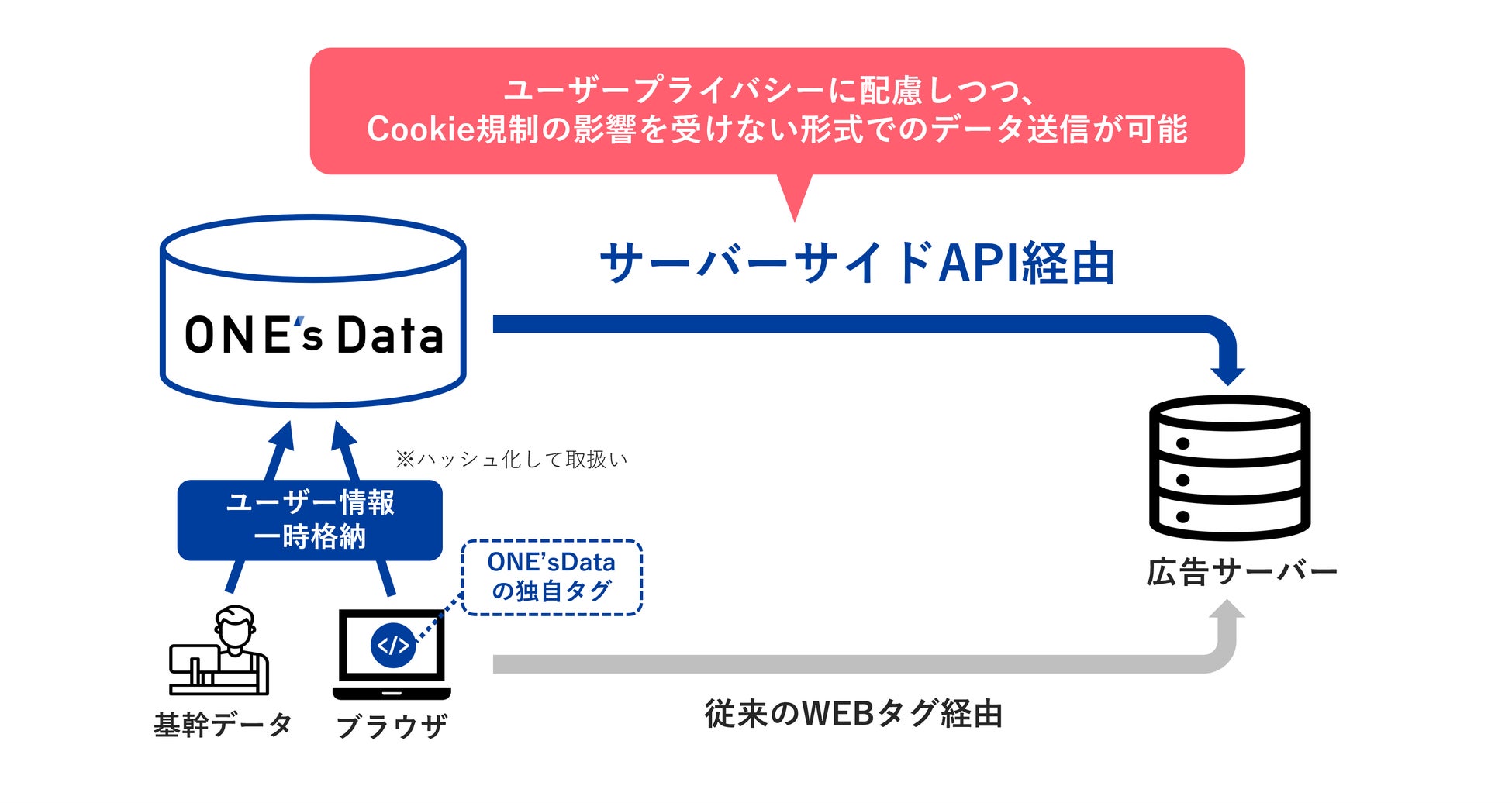 WEBのピクセル等でデータ通信を行っていた最適化データを、サーバーを経由して送信する技術。本技術により、プライバシーをより考慮したデータ活用が可能となります。また、サイトで発火するタグの数が減ることにより、ユーザーへ適切なブラウザ環境を提供することができます。