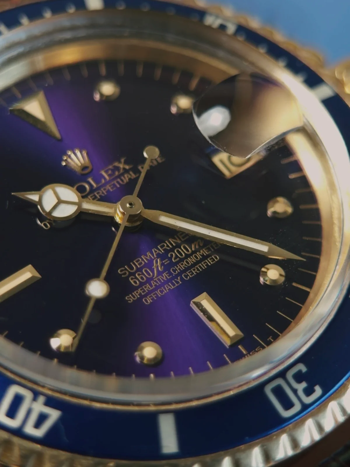 ROLEX 18k YG “PUPLE CHANGE” Nipple Blue Submariner Date 1973s