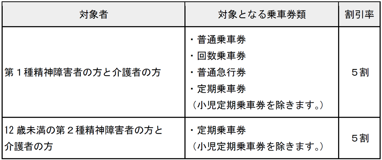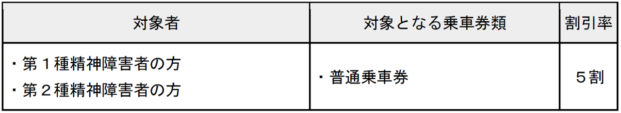 各自治体で発行する精神障害者保健福祉手帳(旅客鉄道株式会社旅客運賃減額欄に第1種又は第2種の記載のあるもの)をお持ちでない場合、割引の乗車券類をお買い求めいただくことができません。また、列車をご利用の際にも必ず精神障害者保健福祉手帳をお持ちいただき、係員から提示を求められた場合はご提示ください。