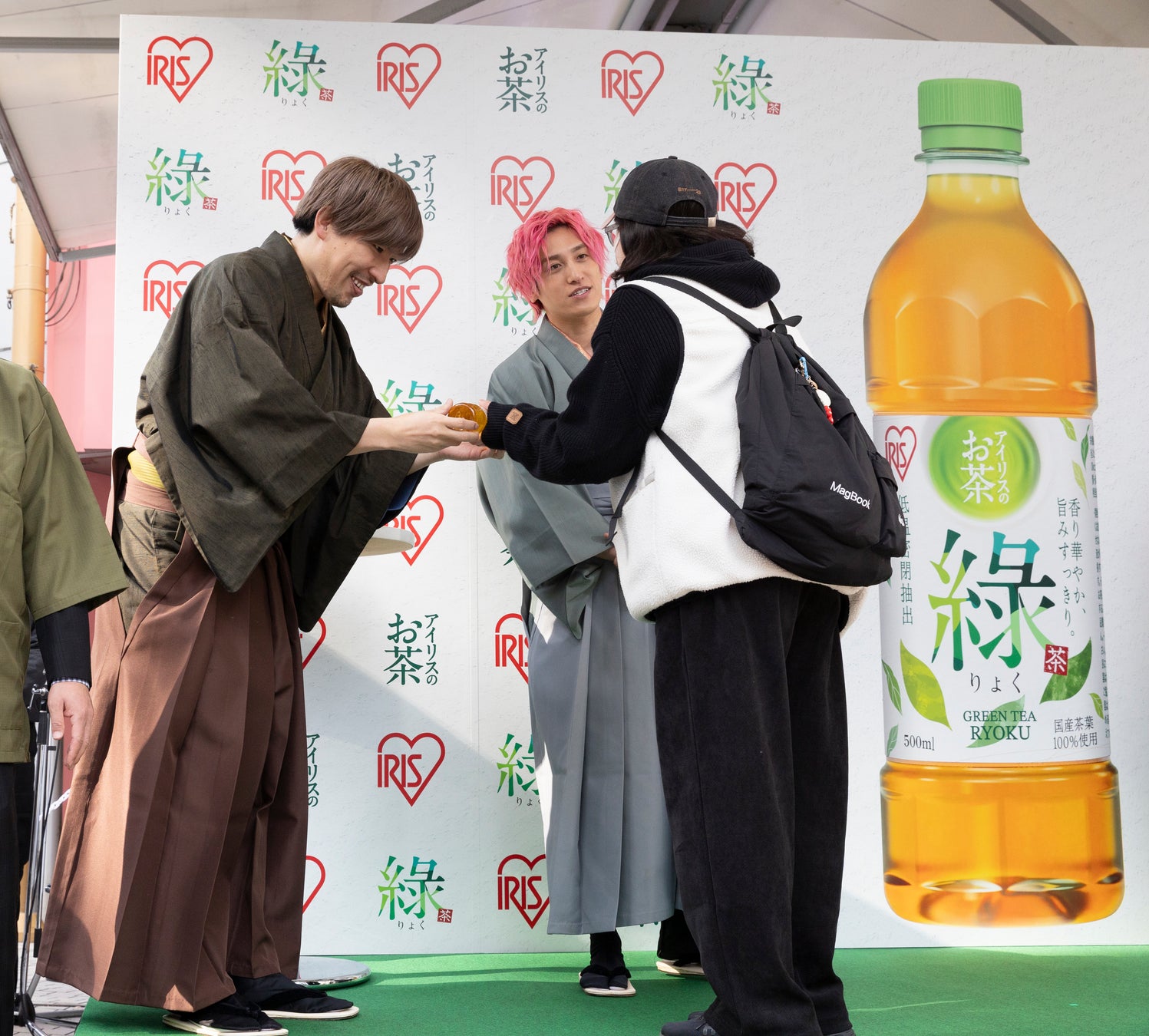 イベントの最後には、EXITとエルフが「アイリスのお茶 綠(りょく)」のサンプリングを実施しました。今後は、3都市(東京・名古屋・大阪)合計で69,000本(「りょく=ろく」にちなんだ本数)のサンプリングを実施予定です。