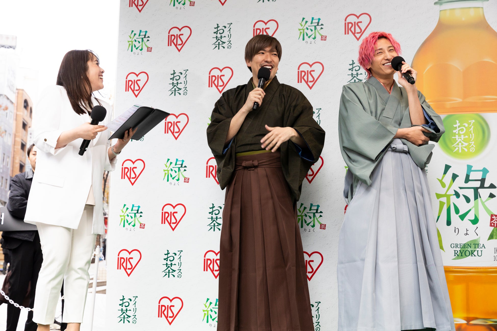 アイリスオーヤマ株式会社(本社:宮城県仙台市、代表取締役社長:大山 晃弘)は、2025年12月2日に、「アイリスのお茶 綠(りょく)」冬のプロモーションに伴うゲリライベントをSHIBUYA109渋谷店 店頭イベントスペースにて開催しました。イベントでは、「アイリスのお茶 綠(りょく)」のTVCMで吉沢 亮さんが演じる伝説の茶人「お綠(りょく)さん」の弟子の座を狙うべく、人気お笑いコンビのEXIT(りんたろー。さん、兼近 大樹さん)とエルフ(荒川さん、はるさん)の2組が和装姿で登場し、トークセッションやゲリラサンプリングで商品の魅力を伝えました。