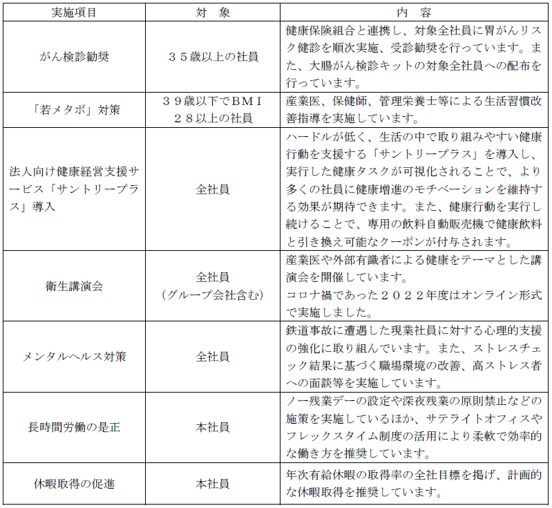 近年では生活習慣病予防の一環として、健康保険組合と連携し、35才以上の社員全員に胃がんリスク検査を実施し高リスク者への受診勧奨を行っているほか、特定保健指導の対象外である39歳以下の社員のうち一定のBMI値に達した者について、産業医や保健師、管理栄養士等による生活習慣の改善指導を行っています。また、2017年度から2021年度までウォーキングをテーマとした健康増進策「京王ヘルスチャレンジ」において運動の習慣付けを図り、健診結果等で効果を検証しました。2022年度はより多くの社員に健康増進の意識を持ってもらうことを目的に、法人向け健康経営支援サービス「サントリープラス」を導入し、運動への関心が薄い層への働きかけを強化しました。