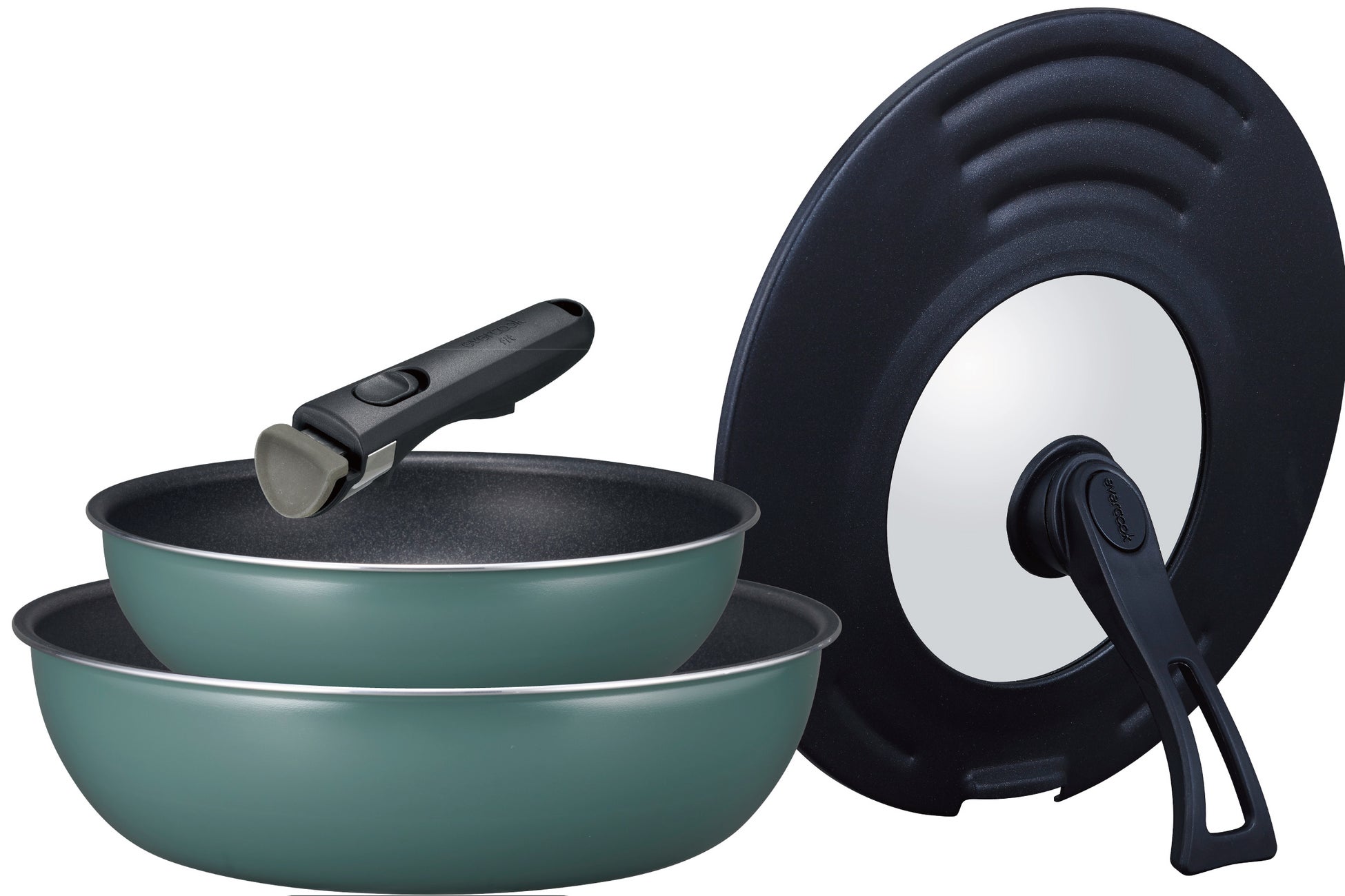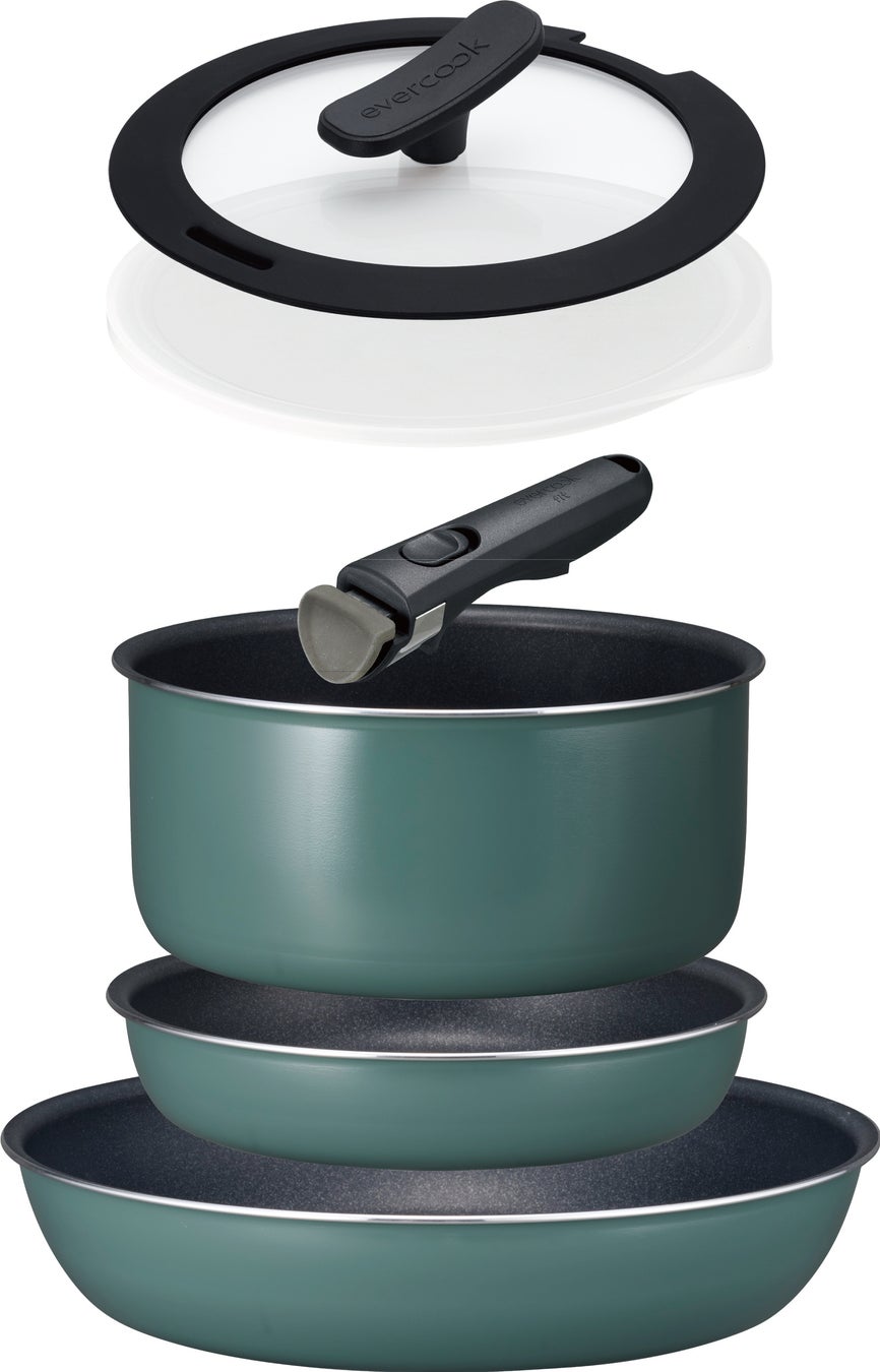 今回発売するのは、取っ手が取れる着脱式フライパン「evercook fit(エバークックフィット)」のセット品です。オール熱源対応なのでコンロを選ばず、落ち着いたグリーンカラーがどんなキッチンにもフィットします。4点セット・6点セットの2種類のセットからご家庭のニーズに合わせてお選びいただけます。