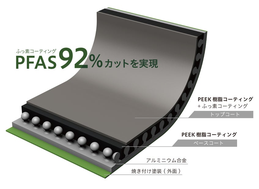 evercook GREENは、フライパン本体のアルミニウム合金に2層のコーティングがされています。1層目のベースコートにはPEEK樹脂を、2層目のトップコートには、PEEK樹脂とPFAS(フッ素)の混合コーティングが塗布されています。