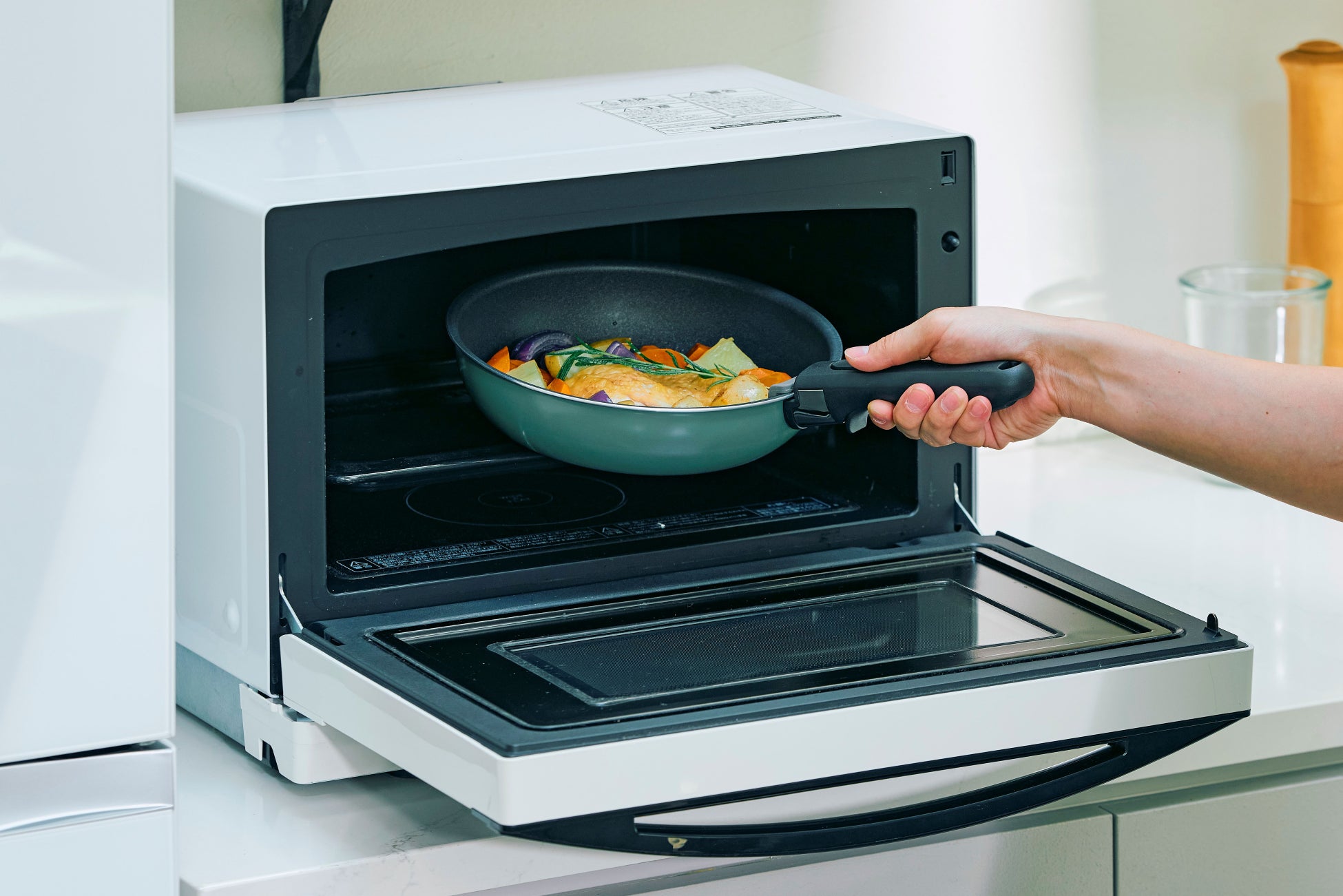 専用ハンドルを外せばオーブン調理ができます。コンロで食材を炒めてからそのままオーブンへ入れることができるので、余計な洗い物が増えません。