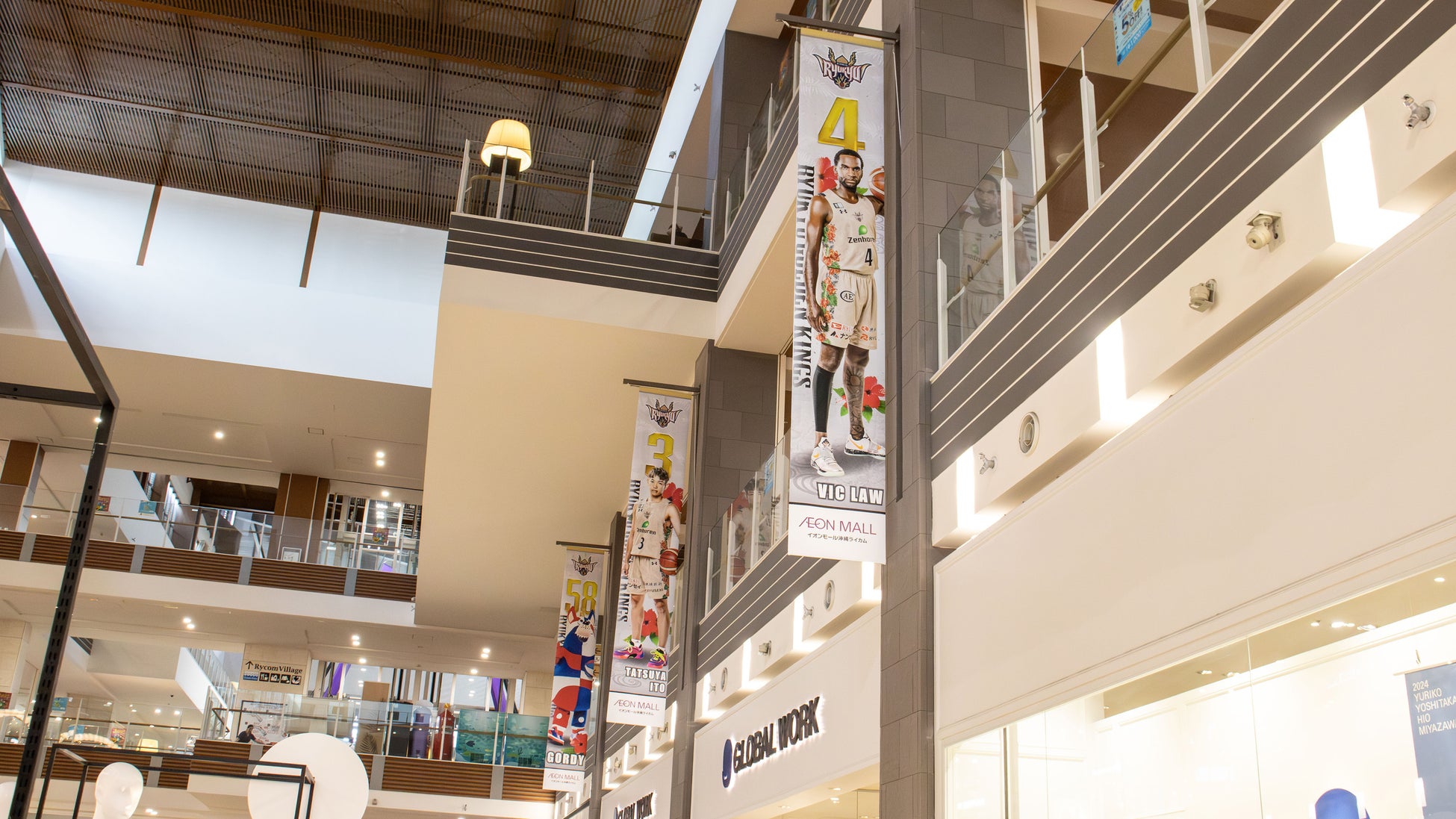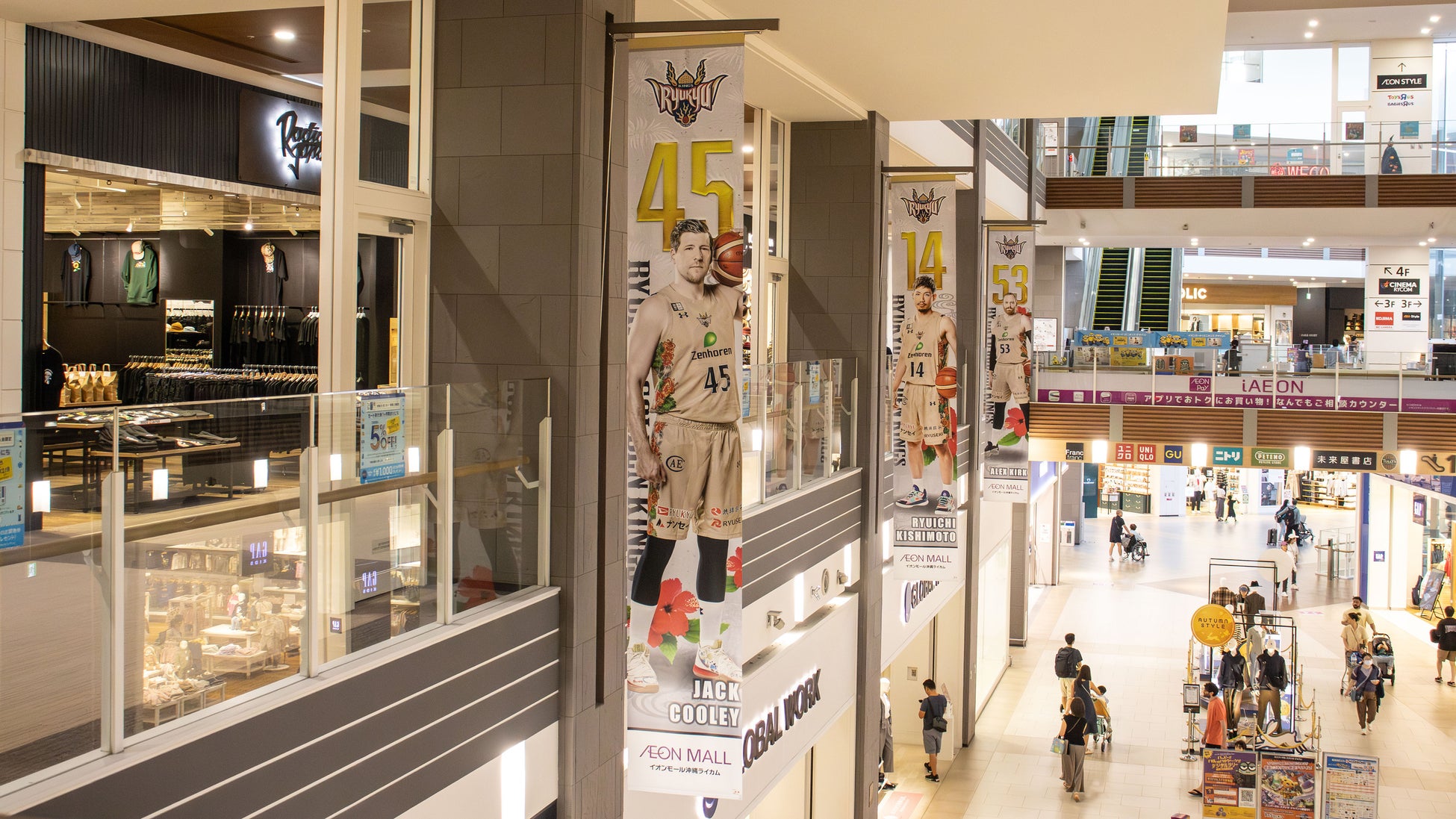 琉球ゴールデンキングスのオフィシャルパートナーであるイオンモール株式会社が運営するイオンモール沖縄ライカムにて2024-25シーズンのキングスコラボ装飾を展示しています。