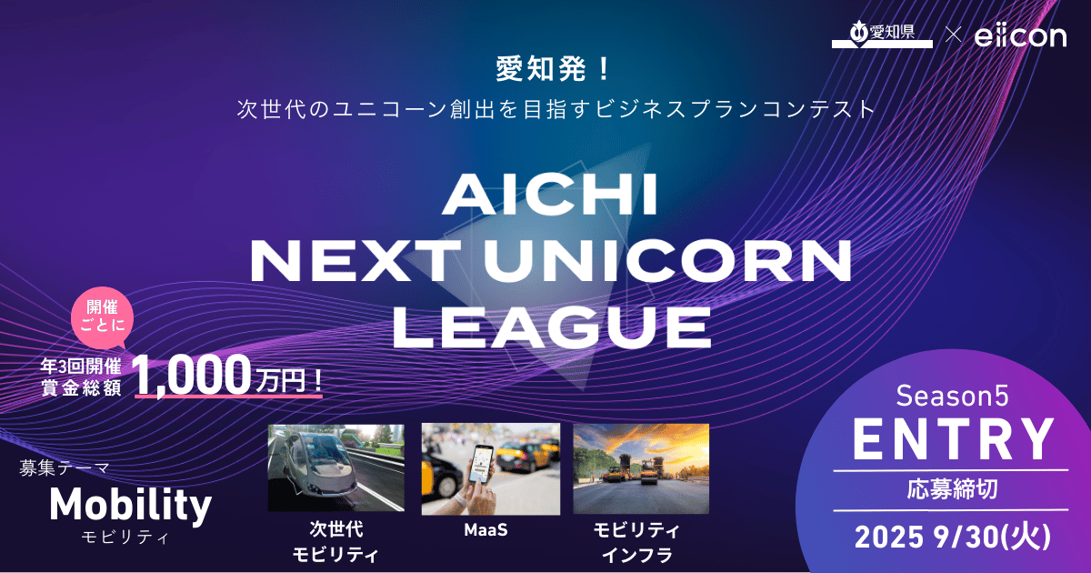 日本最大級のオープンイノベーションプラットフォーム「AUBA(アウバ)」を運営する株式会社eiicon(エイコン 本社所在地:東京都文京区後楽、代表取締役社長:中村 亜由子、以下「eiicon」)は、愛知県主催、次世代のユニコーン創出を目指すビジネスプランコンテスト『AICHI NEXT UNICORN LEAGUE(主催:愛知県、運営:eiicon、以下、「本コンテスト」)』の運営を受託しており、2025年8月よりシーズン5として「モビリティ」をテーマにビジネスプランを募集。多数の応募の中からファイナリストとなった10社が一堂に会し、2025年11月25日に最終審査会(ピッチコンテスト)を開催。審査員による厳正な審査の結果、賞金総額1,000万円(優勝500万円、2位300万円、3位200万円)のビジネスプランが決定しました。