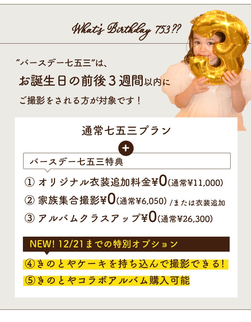 Paletteの人気企画、お誕生日と七五三のW記念をお祝いする「バースデー七五三」。お誕生日の3週間以内に撮影する方には、オリジナル衣装の追加料金無料などのプレゼントがもらえます。