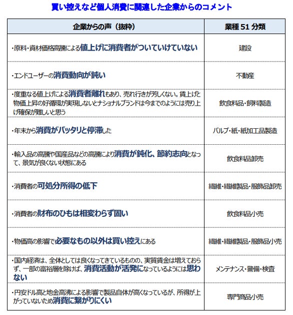 他方、「倒産件数の増加。リスケ相談の増加」(信用金庫・同連合会)といった声も寄せられており、新型コロナ禍より業績改善できないまま事業継続を断念する企業も目立つなど、今後の景気を懸念する声も複数あがった。