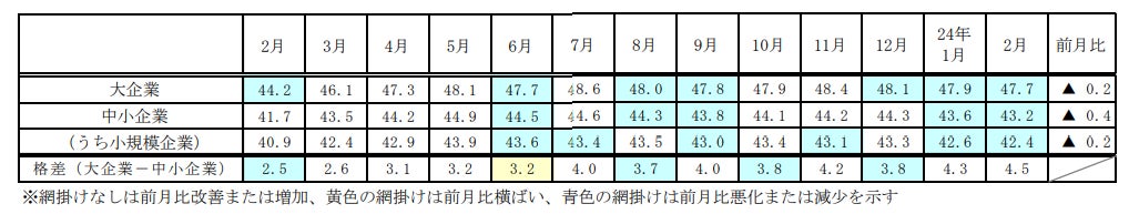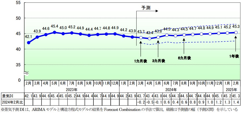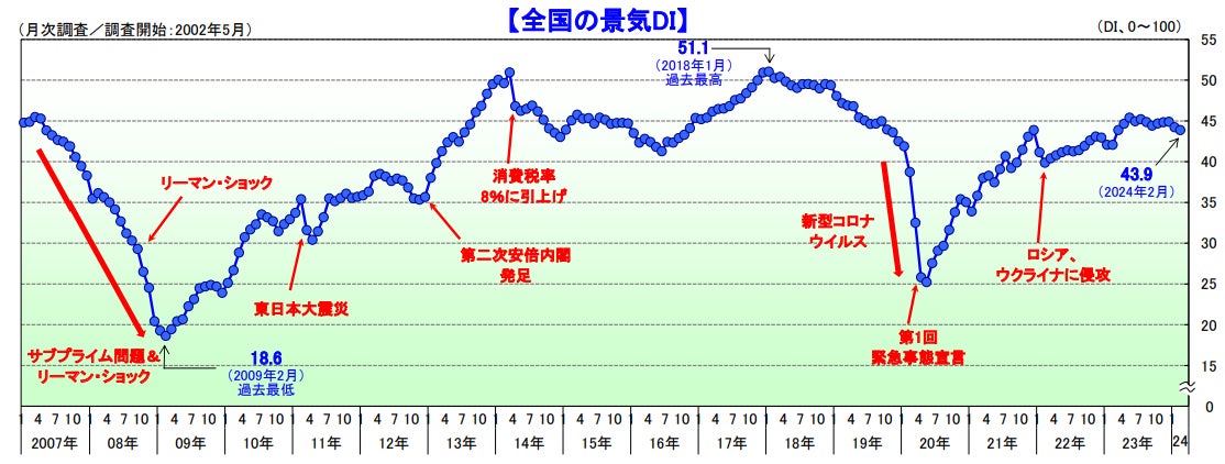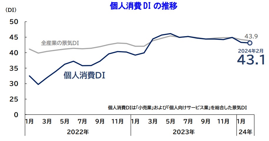 2024年2月の景気DIは前月比0.3ポイント減の43.9となり、2カ月連続で悪化した。