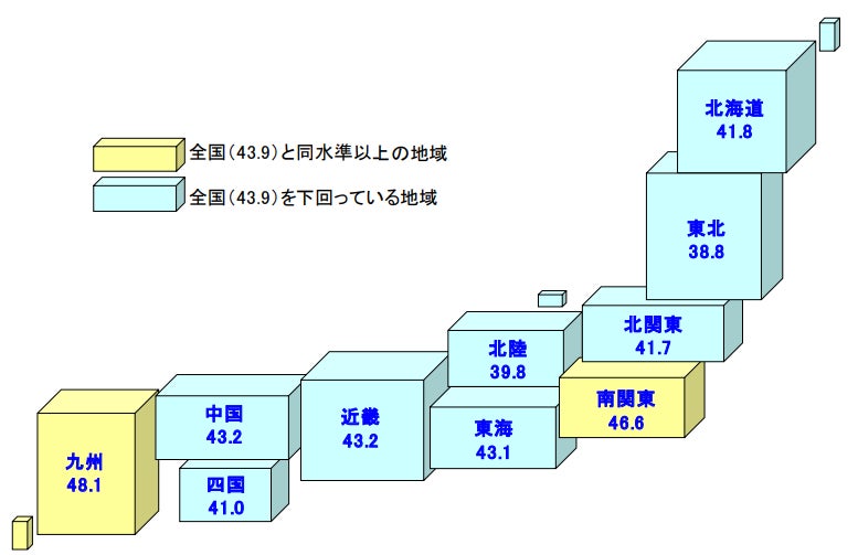 『東海』(43.1)…同1.3ポイント減。3カ月連続で悪化。域内4県がそろって下落した。自動車の生産ラインが停止し、関連する製造・小売が大きく低下した。また「中国経済の動向が懸念」など、低調な海外経済も輸出産業を中心に下振れ要因となった。