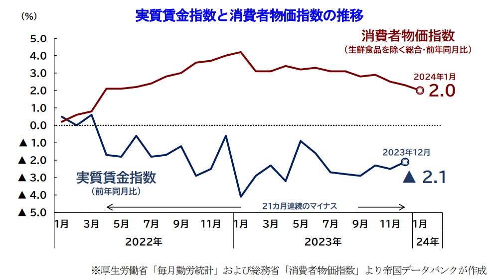 消費者物価指数は5カ月連続の2%台で推移、実質賃金指数は21カ月連続でマイナスとなっている