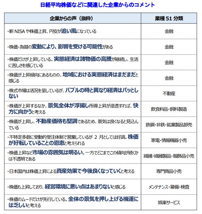 企業からは、日経平均株価の上昇を景気の押し上げ要因として捉える声も複数あがっている