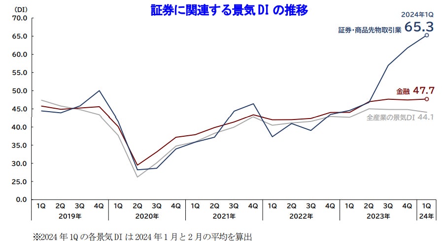 証券・商品先物取引業の直近の景況感は65.3と高水準となっている