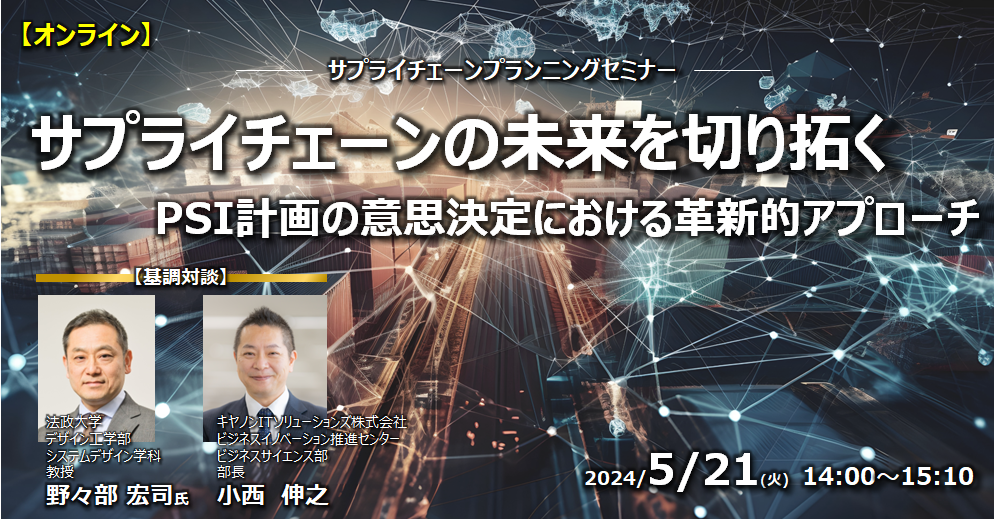 本セミナーでは、法政大学 教授の野々部宏司氏を招き、キヤノンITS ビジネスイノベーション推進センター 部長の小西伸之との対談を実施します。これからのサプライチェーンマネジメントに向けた、資源制約に対応した真のデジタルツインを実現する革新的なアプローチとして、先進的なスケジューリングモデル(RCPSP)について説明します。また、キヤノンITSシニアコンサルティングスペシャリストの吉持敦史より、サプライチェーン計画に焦点を当て、企業が直面している課題を解消するための革新的なアプローチ手法について、企業の活用事例も交えながら紹介します。