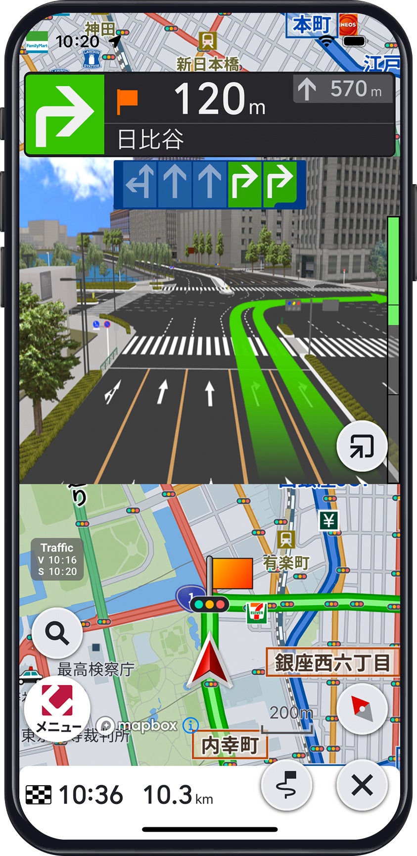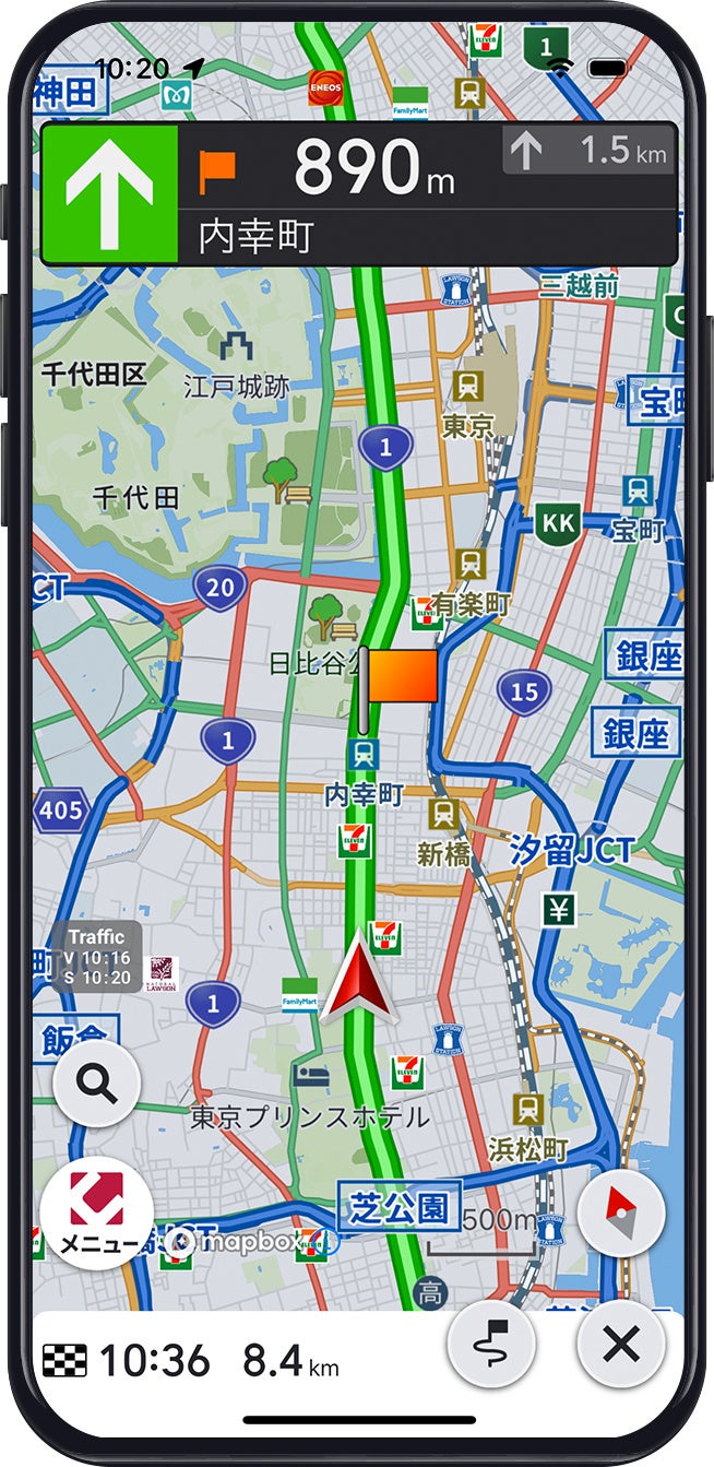 高度なルーティング技術や高い所要時間推定精度をはじめ、カーナビメーカーとしての知見を活かした正確できめ細やかなナビゲーションを、わかりやすい音声案内で提供。「到着が早い」、「コストが安い」、「道幅が広い」の3種類からルート検索方法を指定でき、複数の候補から自身のニーズに合ったルートを選択することができるほか、高い視認性や操作性も実現しています。