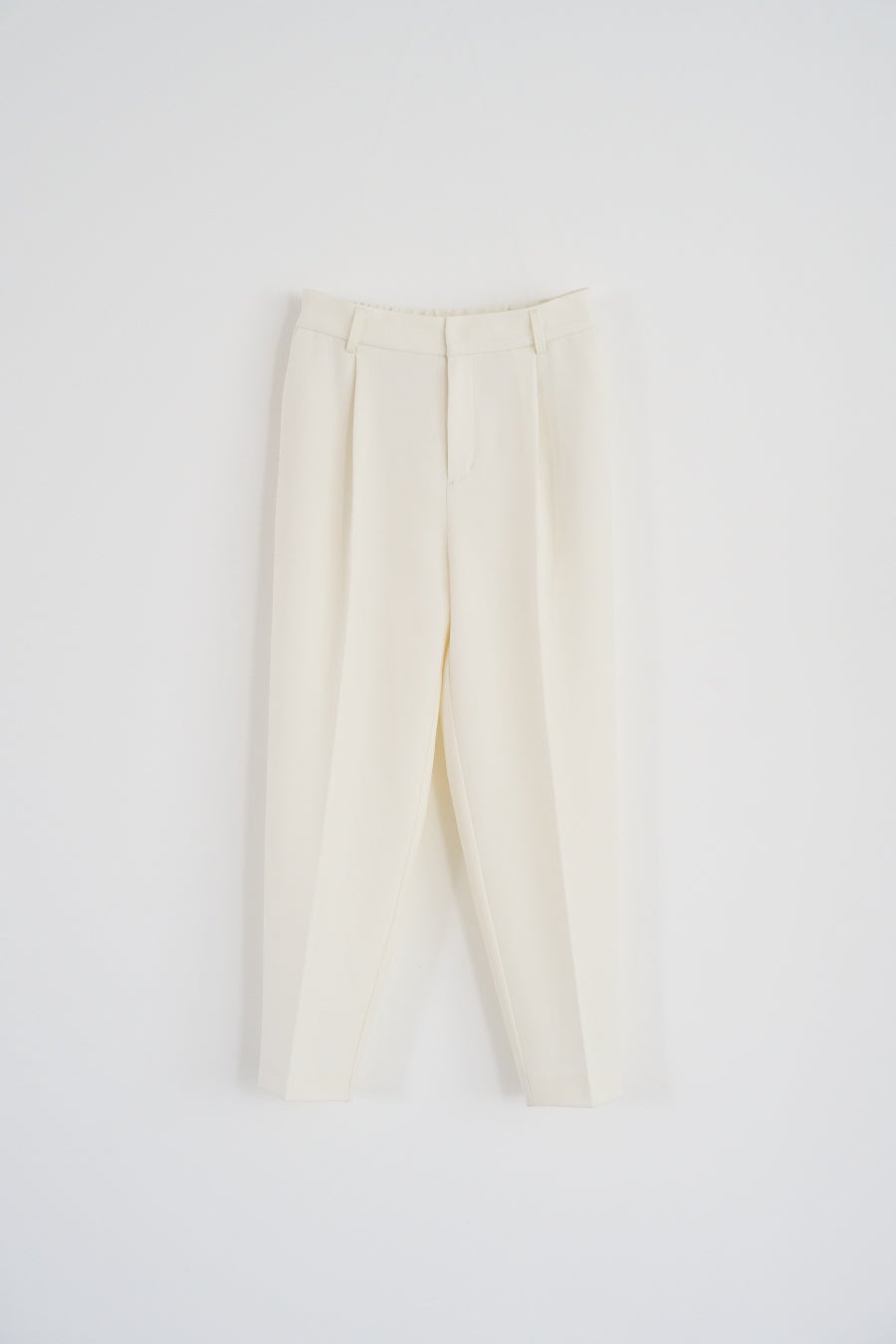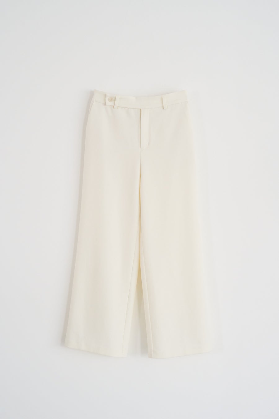 サステナブルな再生ポリエステル素材を加工し、汚れにくい白パンツを開発。白を着る際に気になる汚れを防ぐ「防汚効果」を備えながら、デザイン性もあり、セレモニーやお仕事から普段着まで幅広いニーズに対応します。欲求のおもむくままに、白を気兼ねなく着用できる自由さがあり、コーディネイトに抜け感を出せるパンツです。