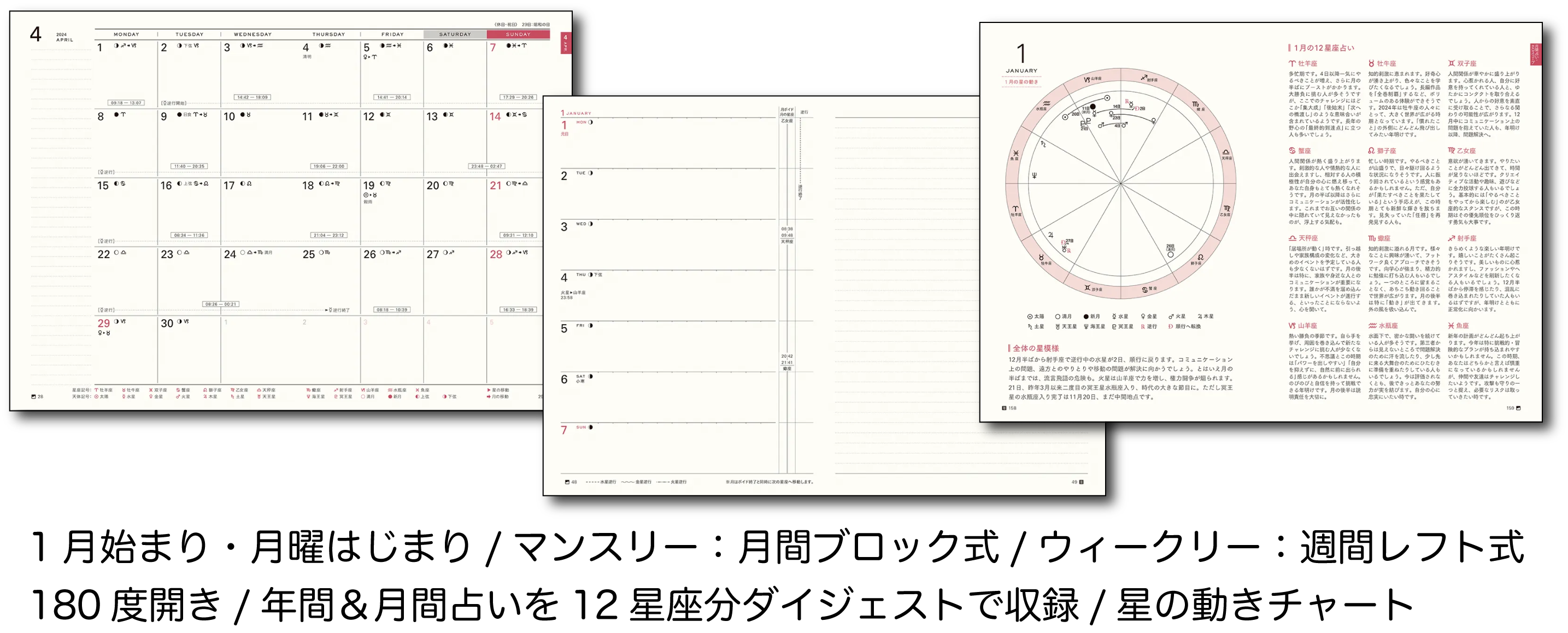 手帳「星ダイアリー2024」は、1冊で全星座対応。シリーズ18年目のロングセラーのこの手帳は、星や月の動き情報と占いが載っており、予定を立てるときの参考にできます。書き込み欄もたっぷり、180度開いて書きやすく、しおりも2本ついて普段使いもOK! こちらも、星栞と同じく、9月28日に発売いたします。