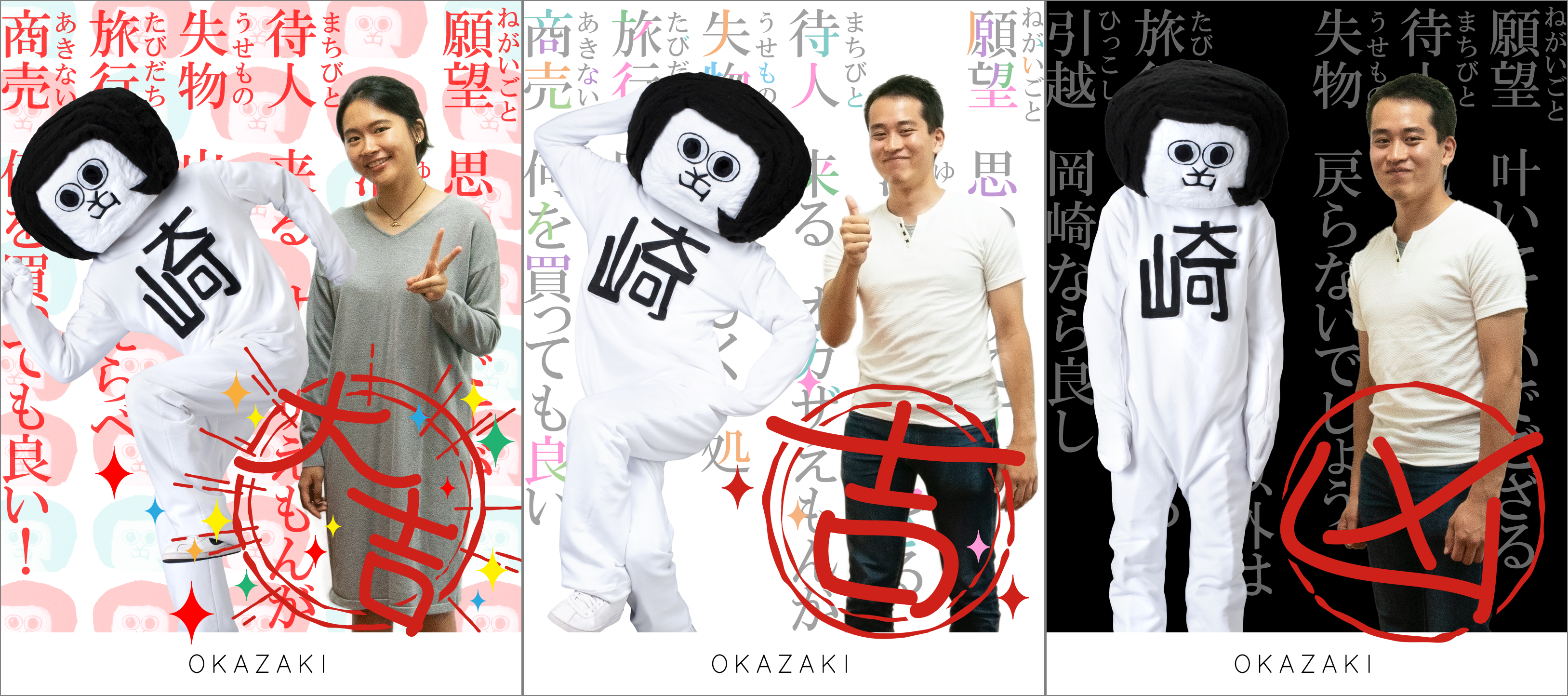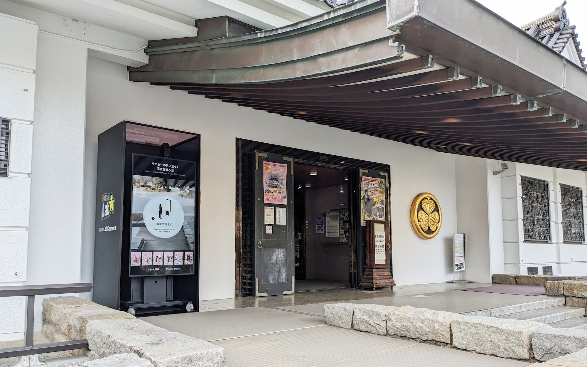 三河武士のやかた家康館前に設置される「チームラボカメラ」では、愛知県岡崎市の岡崎観光伝道師オカザえもんと一緒におみくじ付きの自撮りの写真を撮影することができます。
