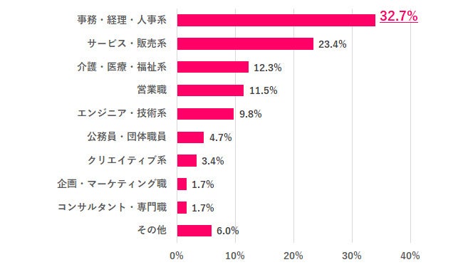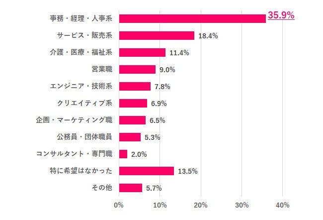 就職活動時に希望していた職種は、「事務・経理・人事系」が35.9%で最も多く、次いで「サービス・販売系」18.4%、「介護・医療・福祉系」11.4%と続きました。