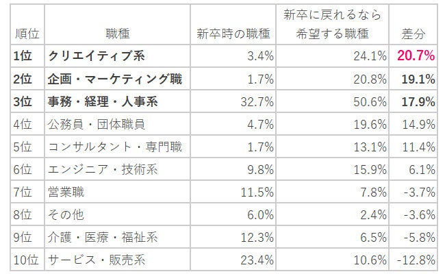 一方、新卒で実際に配属された職種と、新卒に戻れるなら就きたい職種のギャップを見てみると、1位「クリエイティブ系」、2位「企画・マーケティング職」、3位「事務・経理・人事系」でした。社会人経験を積んだ上で考え方や価値観が変わった様子が見て取れます。