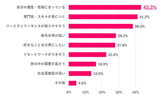 次いで「専門性・スキルが身につく」41.2%、「ワークライフバランスが取りやすそう」38.4%などが続きました。