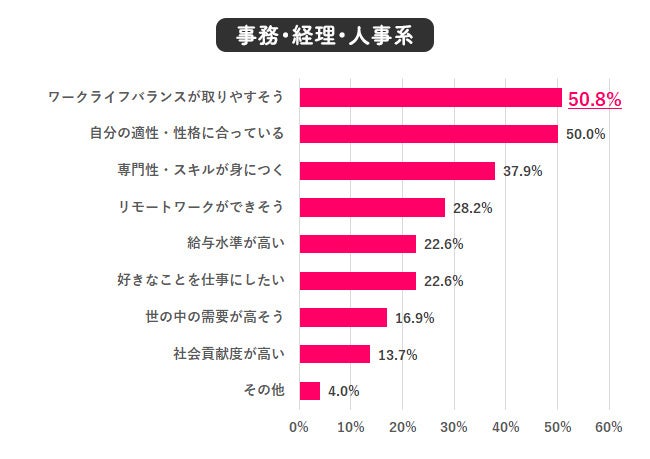 また、Q5で聞いた「もし新卒に戻れるなら、どんな職種につきたい?」の上位3職種ごとに選んだ理由を見てみると、「事務・経理・人事系」を選んだ人は「ワークライフバランスが取りやすそう」50.8%や、「自分の適性・性格に合っている」50.0%が上位でした。