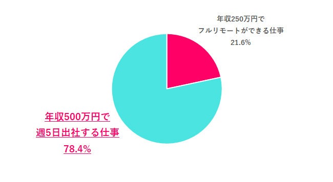 もし新卒に戻れるなら、「年収250万円でフルリモートができる仕事」と「年収500万円で週5日出社する仕事」のどちらを選ぶか聞いたところ、「年収500万円で週5日出社する仕事」を選んだ人が78.4%と多数派となりました。自由な働き方よりも年収を重視する人が多い傾向がうかがえます。