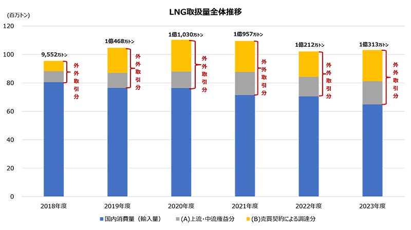 このような方針の下、日本企業のLNG取扱量を把握するためにJOGMECは「外・外取引」を含む日本企業のLNG取扱量にかかる新たな調査を2021年度に開始しました。本年度は4回目の調査として2023年度を対象として実施し、その結果、同年度における日本企業のLNG取扱量は、およそ1億300万トンと判明しました。