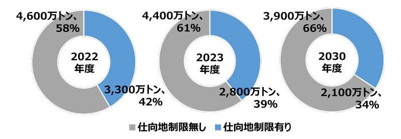 調査の結果、調査実施時点で日本企業により締結されている全契約数量のうち、仕向地制限が課せられている契約数量は、2022年度では約3,300万トンと全体の42%であったものが、2023年度には約2,800万トン、39%へと減少し、2030年度には2,100万トン、34%となることがわかりました。