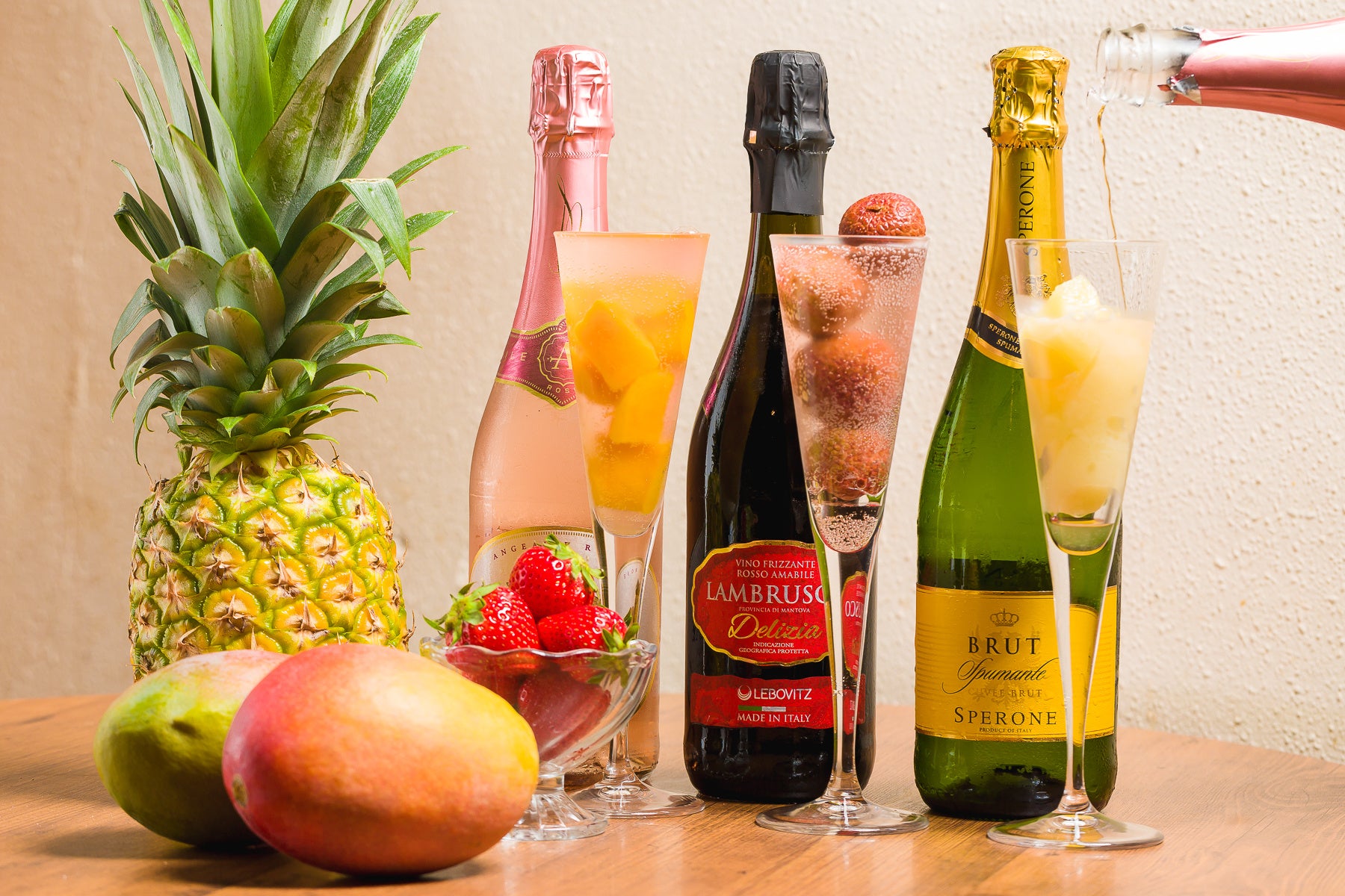 ・ゴロゴロフルーツのなみなみベリーニ(白桃・マンゴーライチ・パイナップル・ベリー) 各880円(税込968円)