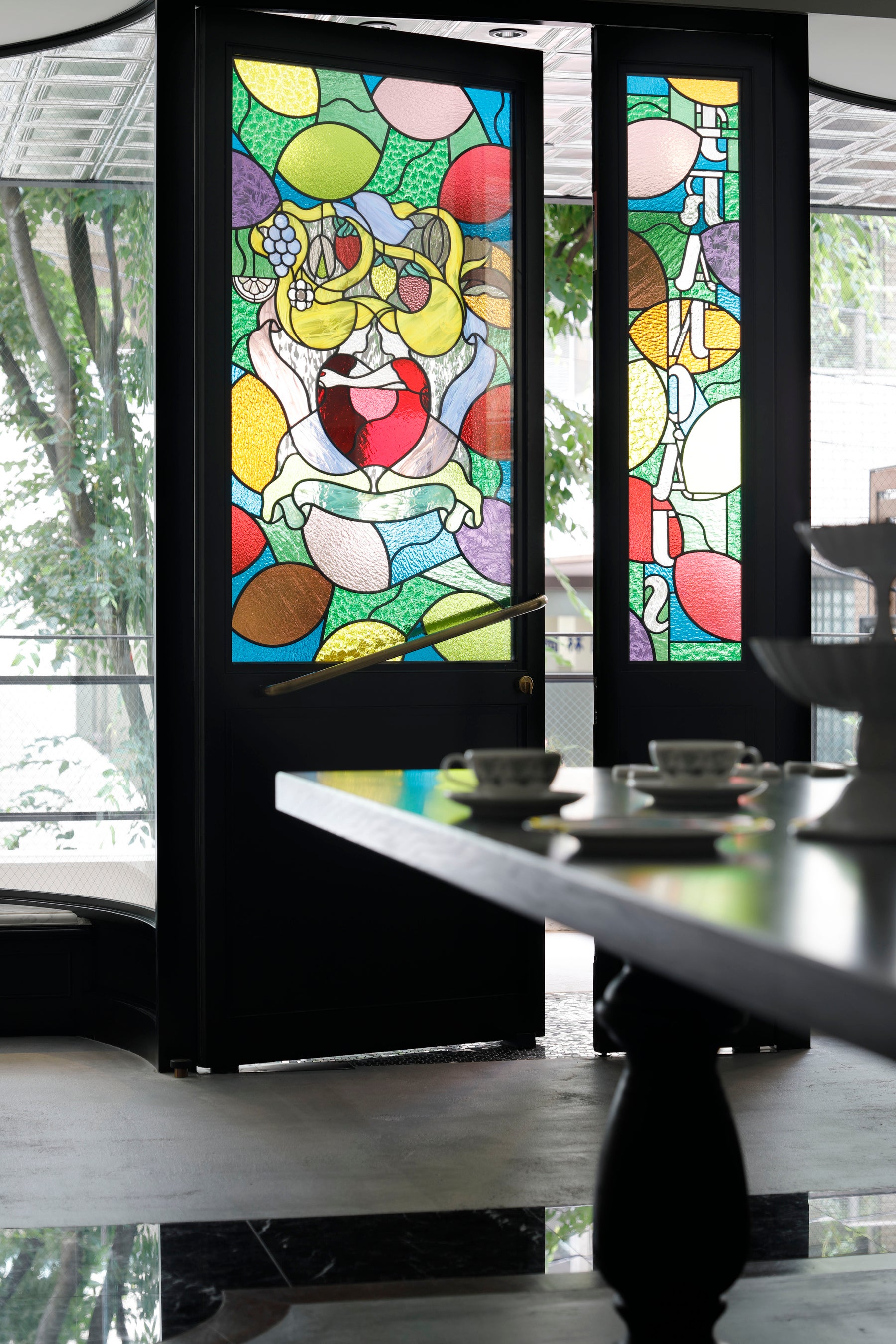その木漏れ日は、職人によって一枚一枚つなぎ合わされたステンドグラスに彩られ、空間をあざやかに光で満たします。そして緩やかに回廊をめぐり、商品をやさしく包み込みます。”降りそそぐ光で果実が育つ”そんなうれしさであふれるお店です。