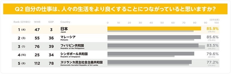 ・日本の「はい」回答者割合は、それぞれQ1:3.8pt、Q2:6.8pt、Q3:4.1pt上昇し、いずれも世界ランキン グの順位がアップした。 ・Q2の「自分の仕事は、人々の生活をより良くすることにつながっていると思いますか?」(はたらくの 「評価」)の「はい」回答割合は世界ランキングで7位となった。 ・Q2について、アジアでは日本は1位となった。 |