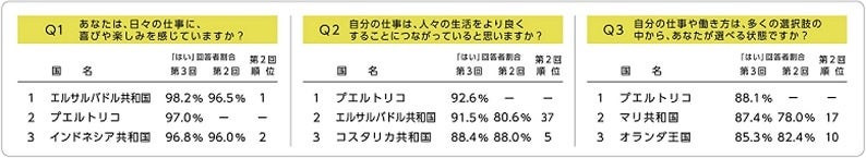 ・世界の「はい」回答者割合は、それぞれQ1:0.5pt、Q2:1.1pt、Q3:1.7ptの低下となった。 ・国別には、Q1はエルサルバドル共和国、Q2とQ3はプエルトリコがそれぞれトップとなった。 ・プエルトリコはQ1でも2位となっている。 |