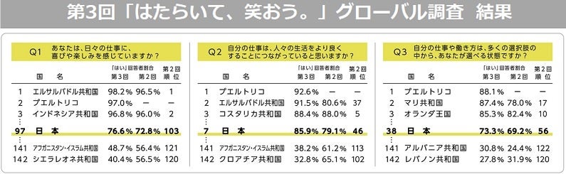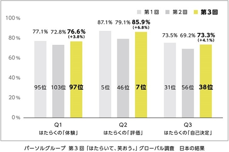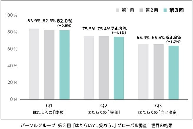 本調査では「はたらいて、笑おう。」の実現度を測るために、その状態を「はたらくの体験・評価・自己決定」の3要素に分解したものを「“はたらくWell-being”指標」と定義し、調査を実施しています。 【質問項目】 Q1. あなたは、日々の仕事に、喜びや楽しみを感じていますか?(はたらくの「体験」) Q2. 自分の仕事は、人々の生活をより良くすることにつながっていると思いますか?(はたらくの「評価」) Q3. 自分の仕事や働き方は、多くの選択肢の中から、あなたが選べる状態ですか?(はたらくの「自己決定」) ・世界全体の「はい」回答者割合は第2回目と比較して、Q1:0.5pt低下、Q2:1.1pt低下、Q3:1.7pt低下となった(※1) ・日本の「はい」回答者割合は3項目すべてで上昇、世界ランキングもアップ ・特にQ2「はたらくの評価」(社会貢献・有意味感)は、世界7位となった